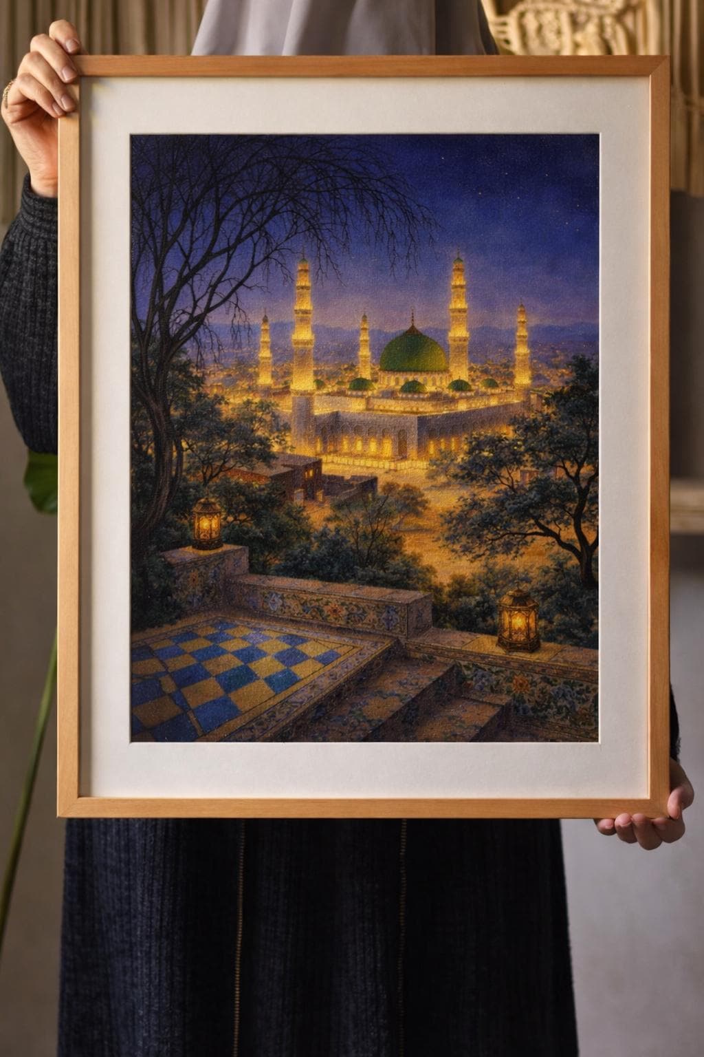 This artwork portrays Masjid Nabawi in the stillness of evening, viewed from the rooftops of the blessed city of our Prophet Muhammad ﷺ. The green dome rests beneath a tranquil sky, minarets illuminated in soft golden light, and lanterns glowing across patterned terraces.