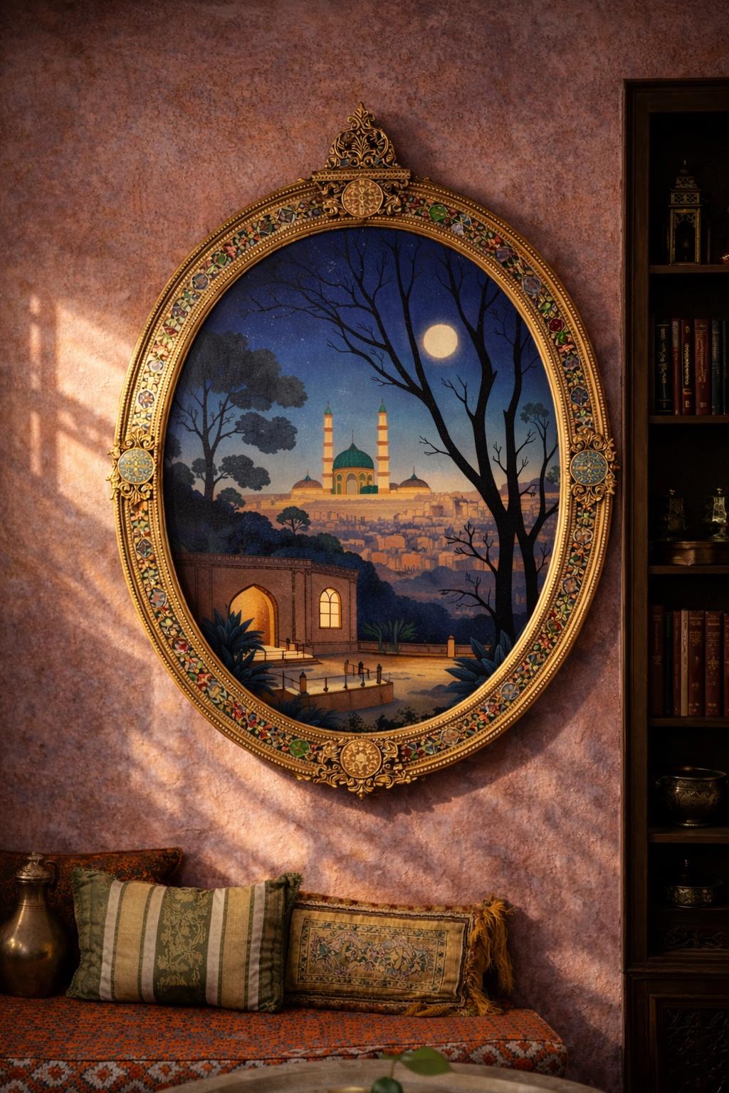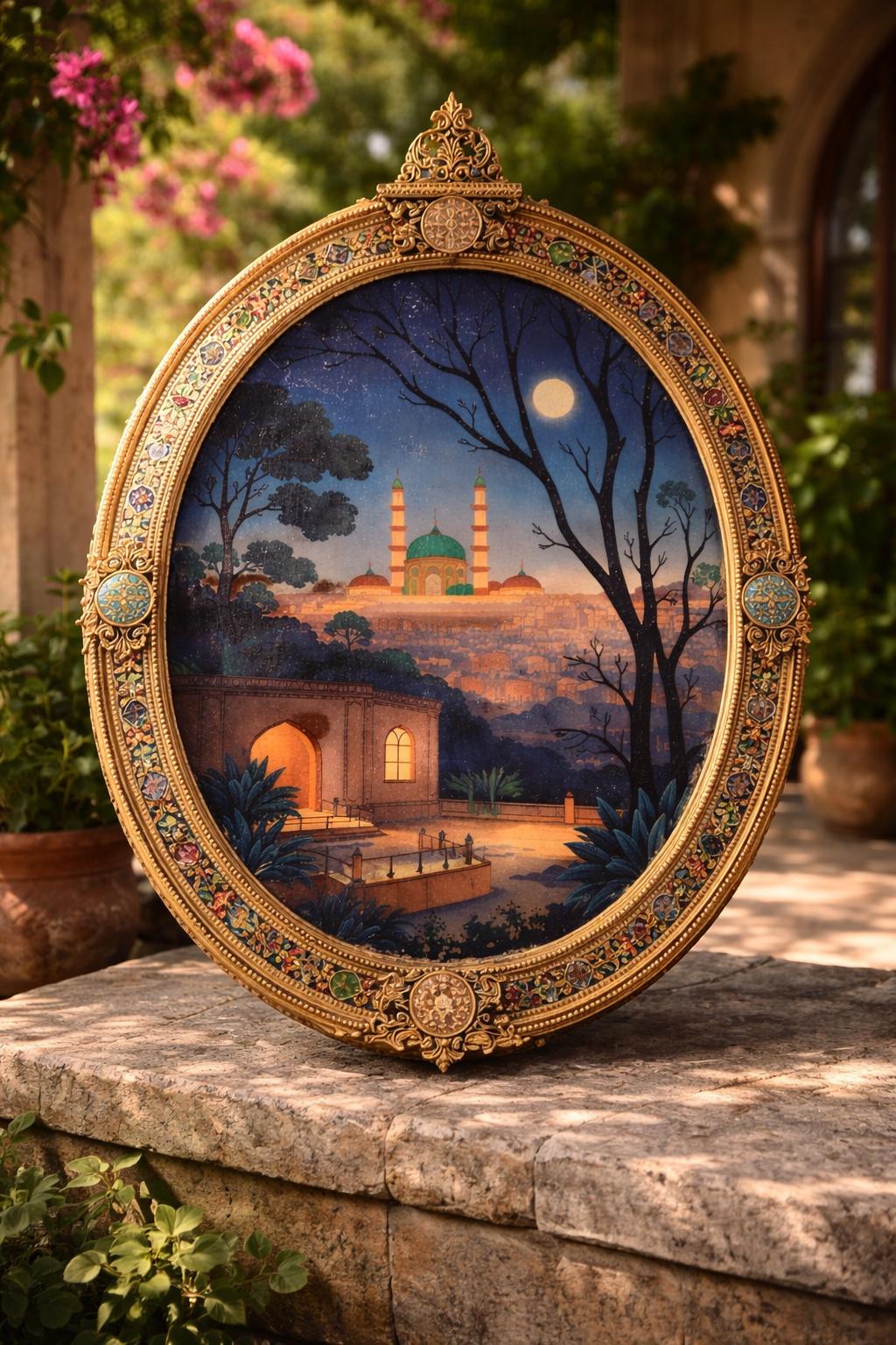 🌙 Masterful Composition - Framed by silhouetted, serpentine trees reminiscent of Art Nouveau and Persian miniatures, the perspective draws the eye directly to the emerald heart of the city.