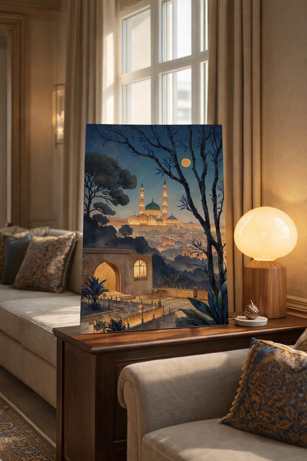 Designed for the discerning collector, this piece bridges the gap between 1920s Golden Age Illustration and modern Romantic Realism. It captures Medina not merely as a location, but as a luminous sanctuary emerging from the deep velvet blues of the Hejaz twilight.