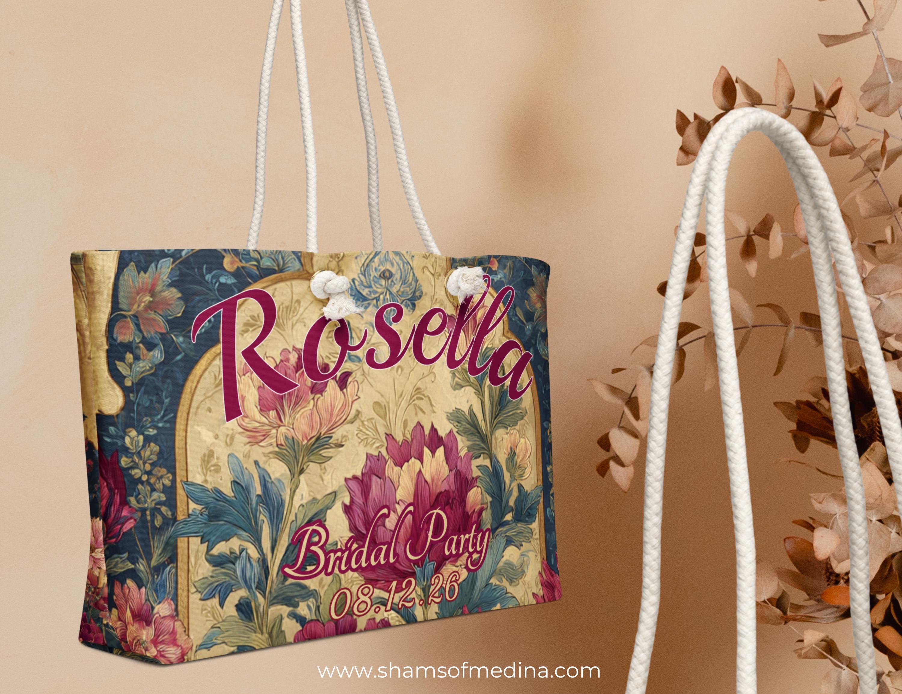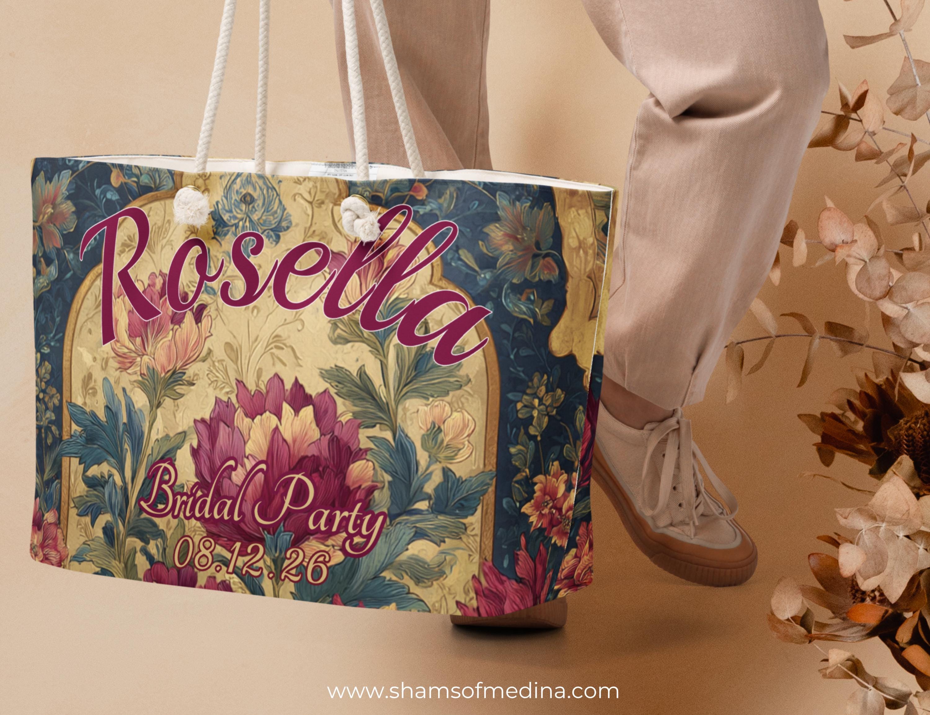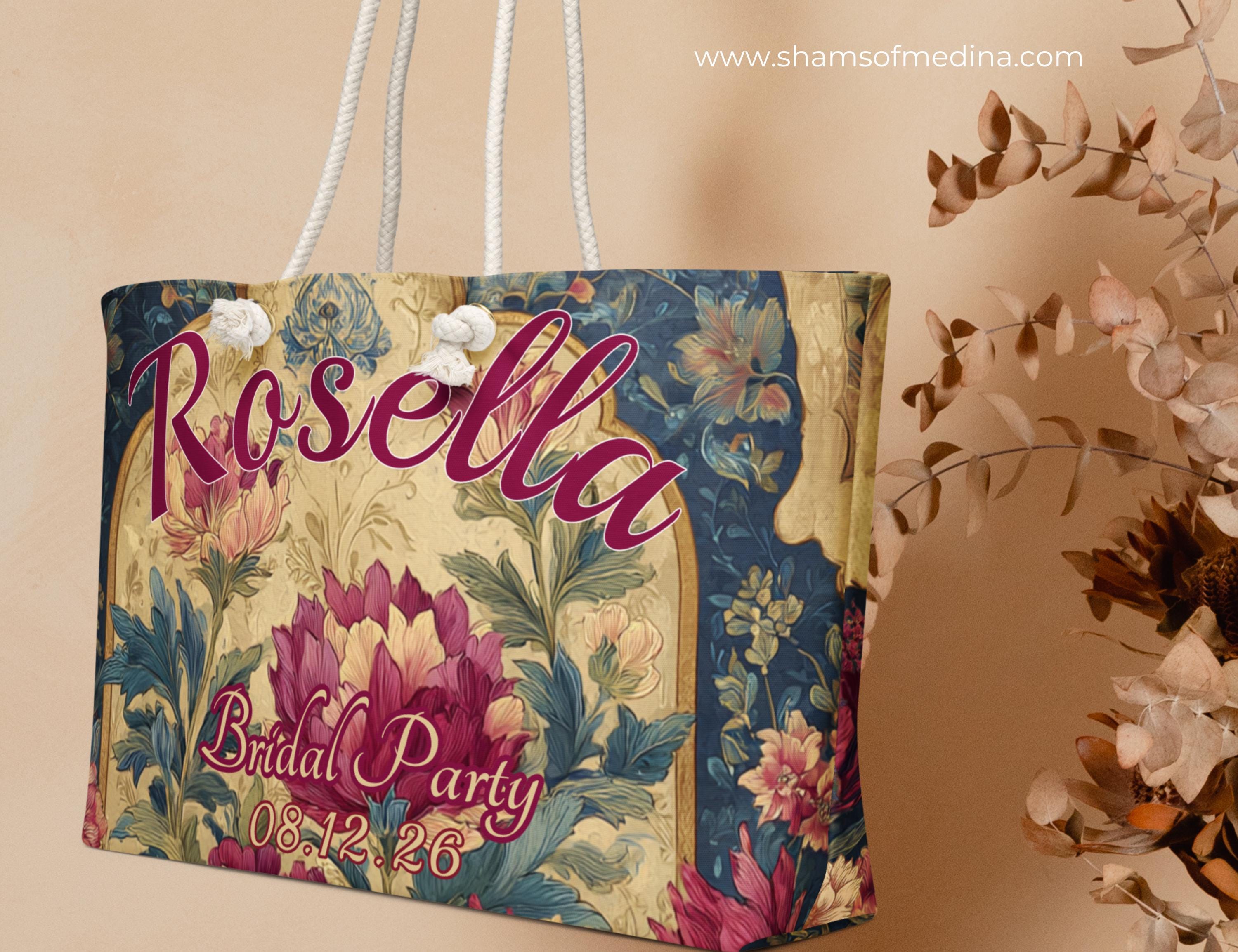 Make your bridal party feel beautifully celebrated with a personalized tote designed just for the occasion. This oversized custom weekender bag features your chosen name and date, making it a thoughtful keepsake for bridesmaids, bridal party gifts, bachelorette weekends, wedding mornings, bridal showers, and destination celebrations.