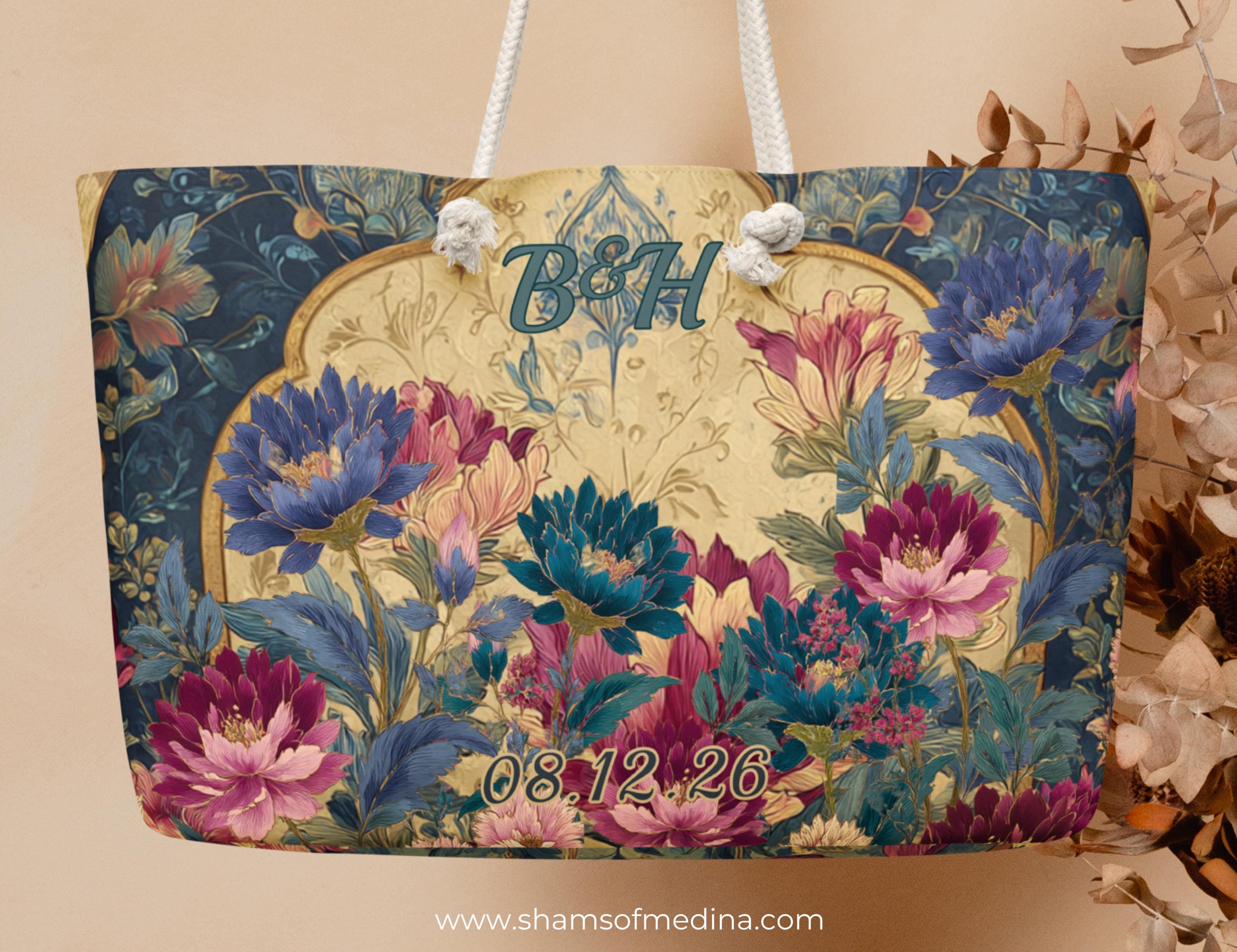 Perfect as a custom bridal tote bag, personalized bridesmaid bag, wedding weekender tote, bridal shower tote, bachelorette party bag, or bridal party gift bag.